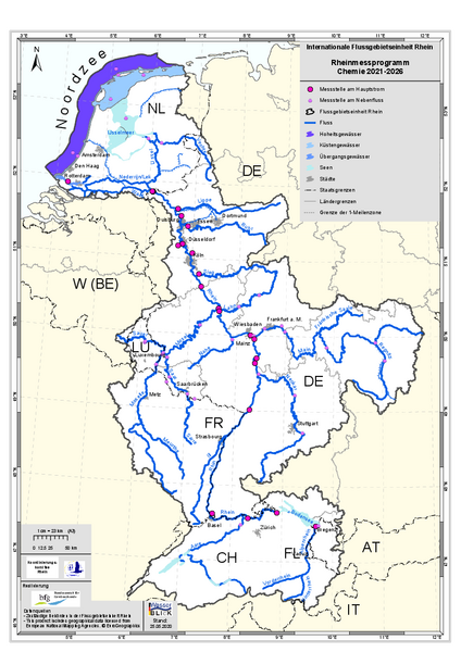 Der Zustand des Rheins wird von der Schweiz bis in die Niederlande überwacht. Die Karte des Rheineinzugsgebietes (unten) zeigt die Lage der Messstellen des Rheinmessprogrammd Chemie.