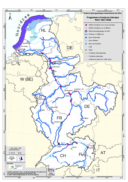 L’état du Rhin est surveillé depuis la Suisse jusqu’aux Pays-Bas. L’emplacement des stations d'analyse est indiqué sur la carte du bassin du Rhin du programme d’analyse chimique 'Rhin' (ci-dessous).