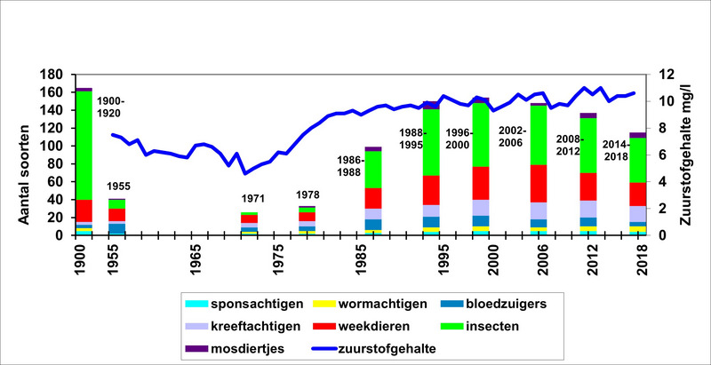 Door de afname van de hoeveelheid afvalwater als gevolg van de bouw van waterzuiveringsinstallaties en door de daarmee gepaard gaande toename van het zuurstofgehalte in het Rijnwater is ook het soortenaantal van het macrozoöbenthos weer duidelijk gestegen.